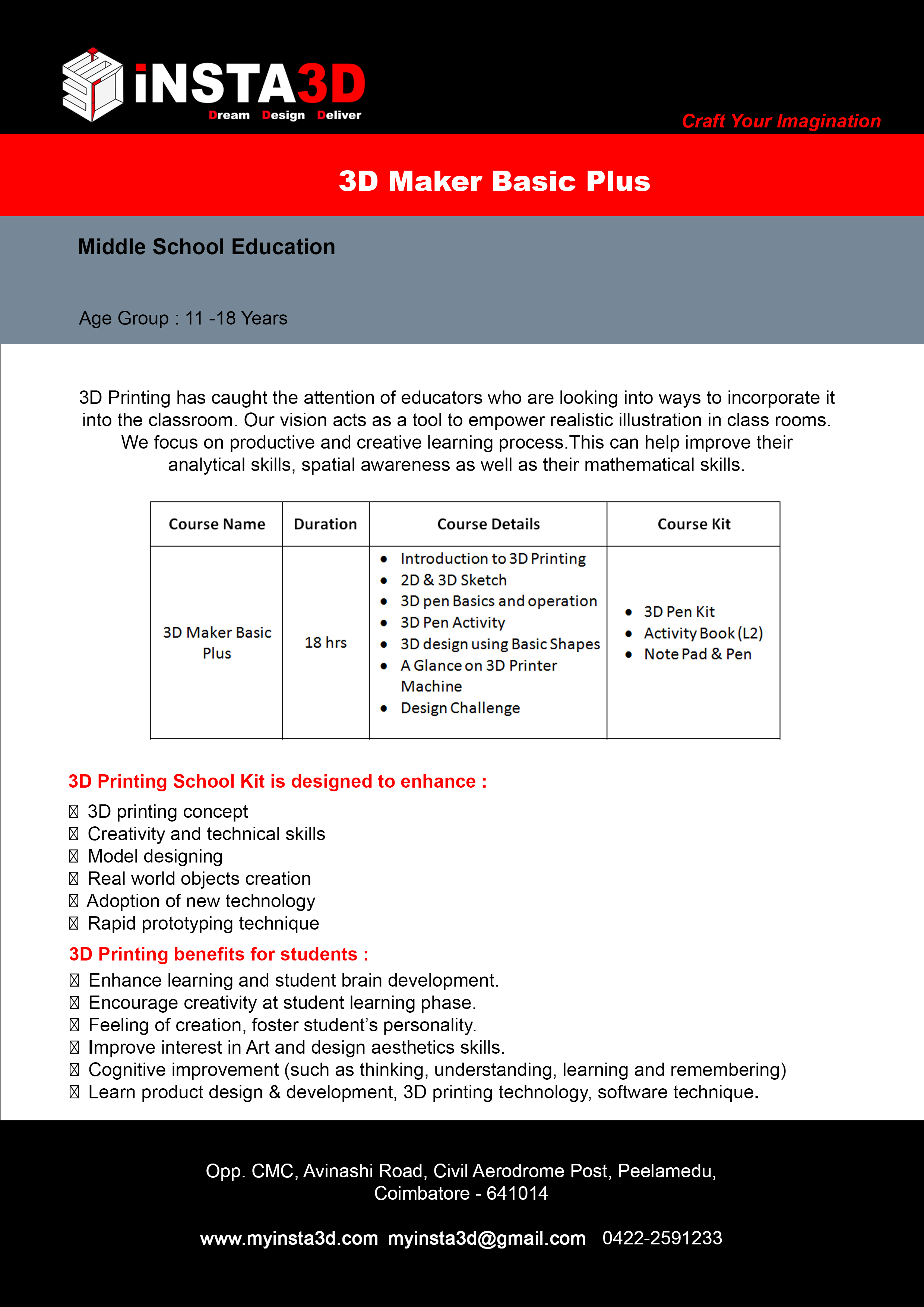 The 3D MAKER BASIC PLUS Program is an advanced course for middle and secondary school education. The course offers hands-on training on 3D virtual modelling and prototyping. It is designed for students exploring a career in digital world. The course contains advanced training in 3D Pen, 3D Designing and 3D Printers with a practical level of approach.